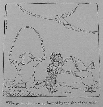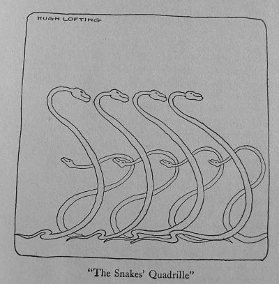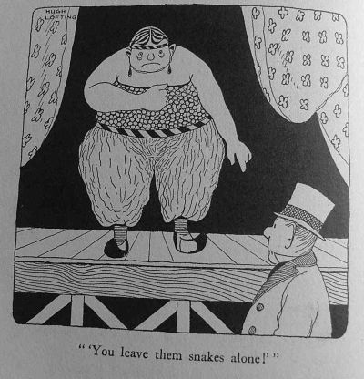 John Dolittle's chief occupation in his spare time was, as I have told you, thinking out new and interesting animal shows. And in doing this he always kept the children particularly in mind as an audience, and designed his plays and entertainments more for them than for the grown-ups. The success of the Talking Horse and the Puddleby Pantomime showed him that his knowledge of animal languages could be put to great use here. The snakes which he had bought from Fatima, for example, were later trained by him to give a little show of their own. Instead of a snake-charmer's tent with a stupid fat woman in it, pretending to be something that she wasn't, the Dolittle Circus had a side show where the snakes gave their own performance, entirely unaided by any person. To the tune of a music box they danced a very peculiar but graceful sort of dance. It was something like a mixture between a quadrille and a game of cat's cradle. On a little stage of their own they glided about on their tails in time to the music, bowing to their partners, doing the grand chain, looping into knots with one another, drilling like soldiers and doing a hundred fascinating things that people had never seen snakes do before.