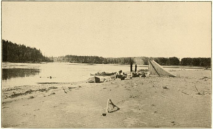 We made ten miles or more before the steamer overtook us, and we had high hopes of beating it out. I had a pleasant recollection of another night that I had floated down this river by the light of the Aurora. Unfortunately a thunderous cloud came rolling up, and we were compelled to go ashore and pitch the tent for shelter. We ate our supper while it rained and thundered a little, but it was one of those abortive squalls that hang fire. The rain stopped, but the clouds refused to clear. After waiting a while, we decided to chance it, and making our beds in the boat, we pushed off in the current. My partner turned in, while I sat up to take the first watch. We couldn't both sleep, because there are rapids in the Athabasca.