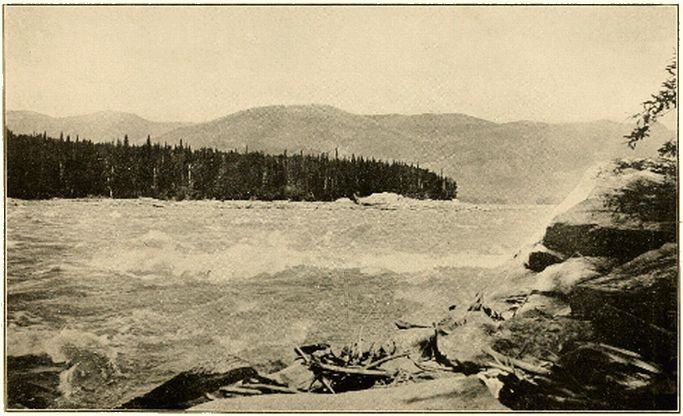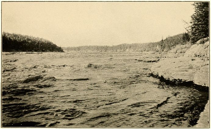 The rapids followed. As usual we had been warned against them, but they proved to be mere child's play after what we had been through. Since the last time I descended these rapids the government has built many wing dams to assist navigation. These are breakwaters extending out from the shore to force the current into a[262] narrow, deep channel. The water cascades through like a gigantic mill-race, but it is perfectly simple to run them; you simply let her go down the channel marked out for you. Building these dams has had the effect of backing up the water between the rapids, and there were long slack stretches that made tedious paddling. The rapids could not come often enough to please our impatient souls.