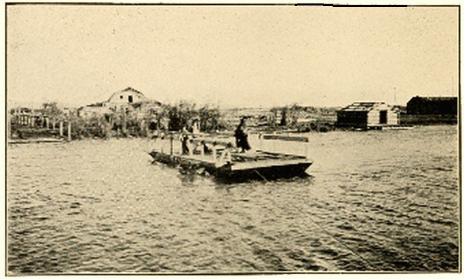 There was an anxious moment or two as we came close in and there was still no sign of any opening. The roar of the surf was deafening. At the rate she was traveling, if she had struck anything, the Blunderbuss would simply have folded up like a fan. The oddest part of it is that we never did find the mouth of the river.[255] While we were still looking for it, the low sand bars flew by on either side of us and we were in it. We roared over the bar, dragging a wave after us like that turned up by a steamboat. An instant later we rounded a bend and floated in smooth water, a little dazed, a little stiff in the arms, and very proud of ourselves.