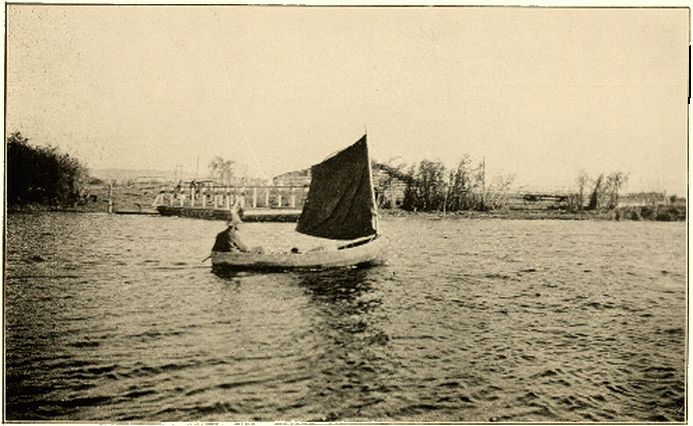 This was something of an ordeal for a collapsible boat. The Blunderbuss was really no more than a kind of canvas bag, stiffened with a few half-hoops of ash, and we had of course neither center-board nor rudder. Our mast was a poplar sapling erected with a couple of nails and a[253] bit of rope. How it all hung together is still a mystery.