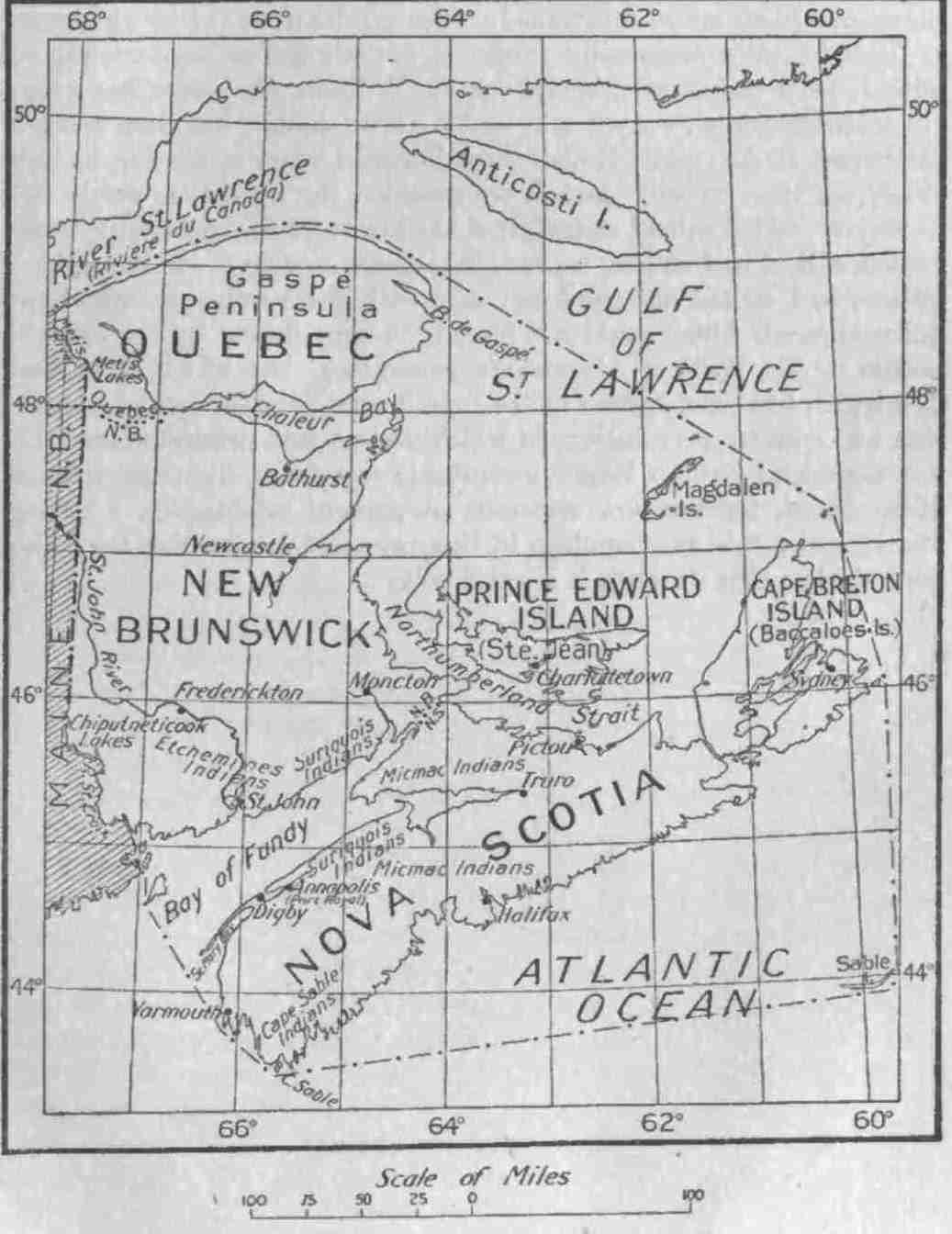 The lands and islands within the promontory of Cape Sable, westward to the roadstead of St. Mary, crossing its entrance or mouth of that roadstead to the St. Croix River, following to its remotest source, from that indefinite place, direct north to the St. Lawrence; eastward along the south shore of that river to Cape Gaspé, then south-southeast to the right of the Bacalaos Isles, onward to the mouth of the Gulf at the northernmost point of Cape Breton and from there southward to and including Sable Island, and to the starting point of that Cape.
