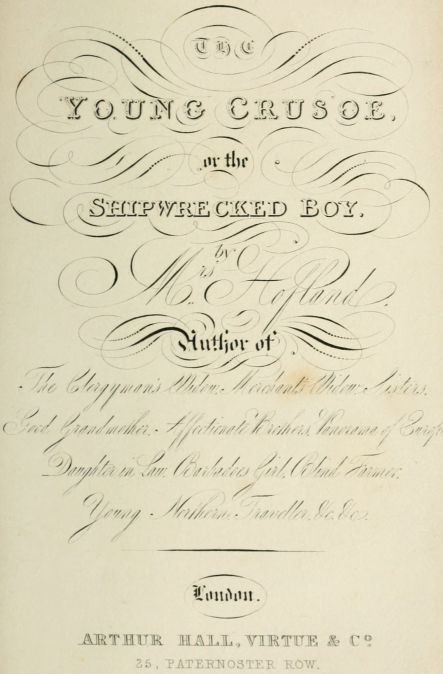 Our young friend was, at this time, about ten years old, and was happily blest with an excellent constitution, which the cares of his mother preserved to him, though they were not equally effective for her daughter, who was about two years younger, and was very delicate. When indeed she had attained her tenth year, the little girl became so poorly, that the medical men entreated Mrs. Crusoe to set out with her for England; and accordingly they departed for their native land, at a very short notice.