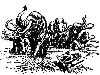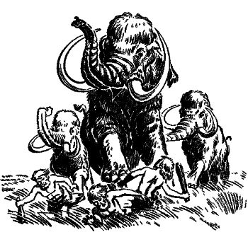Hawk, the Chief Spear-Maker, licked his lips. Though the tribe had seen much game in the past few days, most of it had been either too agile or too fierce for the hunters to attack. Even the mammoths had learned that only in numbers lay safety from human hunters, and aside from occasional small game the tribe had seen nothing except herds of big, dangerous beasts. It was suicide to attack a herd of mammoths, even with fire, for one such animal was capable of engaging every hunter in the tribe. But the giant bison were a different matter.