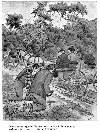 L'autre voiture arrivait; celle du bon Dieu. Nous nous agenouillâmes sur le bord du chemin, saluant tête nue le divin Voyageur.