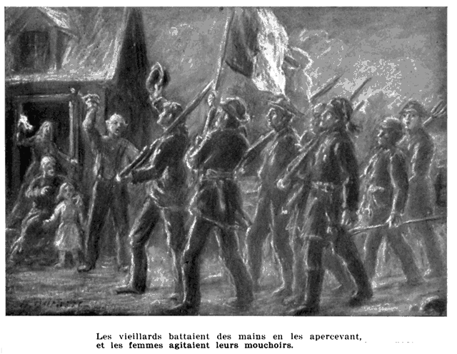 Je vis, un peu à l'écart, sur des tablettes encore modestement garnies, des noms chers à notre jeune patrie. Tout à coup plusieurs volumes, des petits encore timides, des grands déjà prétentieux, se grouper autour d'un vieux compagnon, un humble, un infatigable travailleur dans le champ de l'histoire, Garneau. Et lui, il se mit à leur raconter d'une voix vibrante d'émotion, et avec une fidélité que rien ne pouvait intimider, la longue suite de nos luttes sur les champs de bataille ou dans l'arène politique, nos sacrifices, nos douleurs, nos espérances et nos gloires.