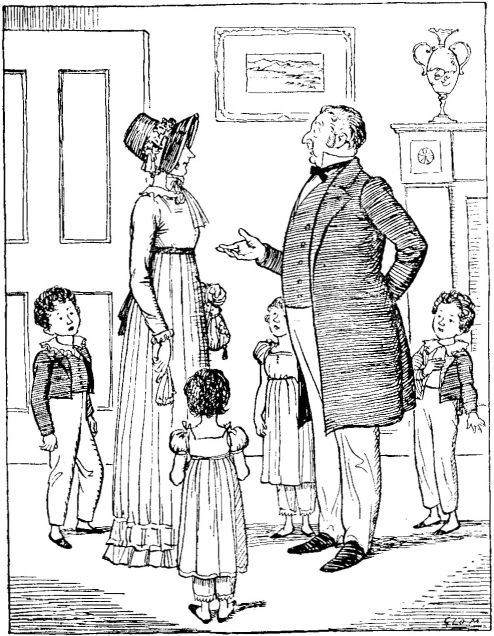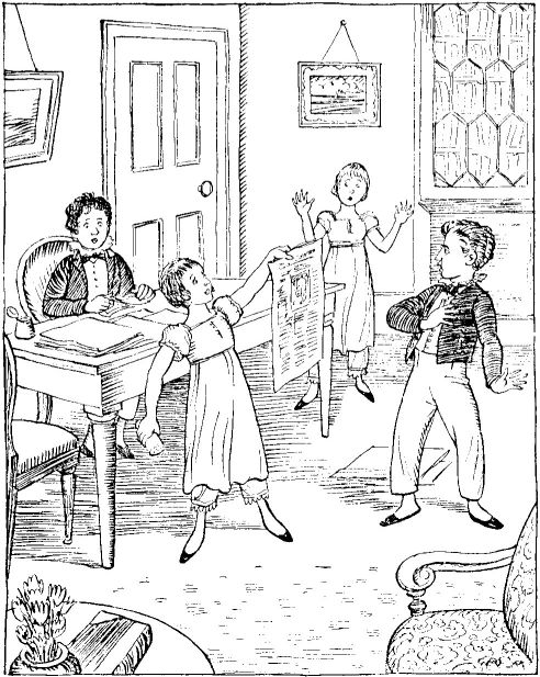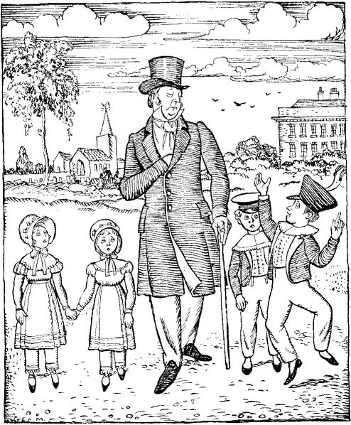 'Come, children,' said Mrs. Birdikin, entering the breakfast-parlour where the four young Birdikins were plying their tasks under the supervision of Miss Smith, 'your good Papa is now able to resume walking exercise and wishes that you should all accompany him on this fine morning, if Miss Smith will kindly consent to release you half an hour earlier than customary.'