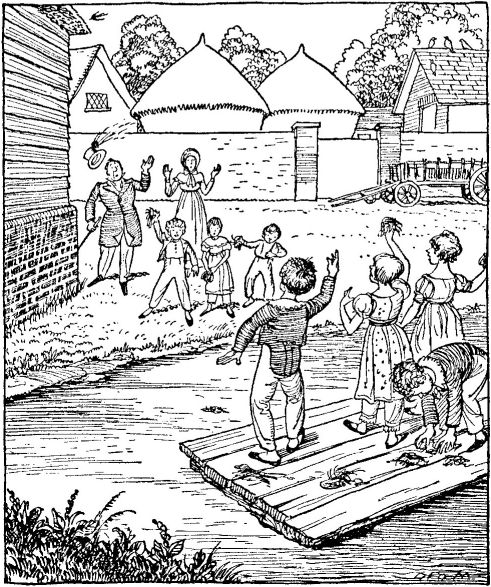 They then returned to the summer-house, now supposed to be the homely cot of a tiller of the soil. There they were met by Clara, who had in vain tried to persuade Thomas and Fanny to descend from their hiding-place. She at once disclosed their situation, to the intense annoyance of Fanny, whose ruse was thus discovered. 'Tell-tale!' she cried, and before the word was well out of her lips she had slipped from the precarious slope of the roof and fallen upon Henry, whom she bore to the ground, upsetting the basket he was carrying and ruining her freshly-washed and ironed cotton frock with the juicy fruit, upon which she subsided in a sitting posture.