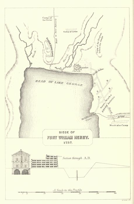 He chose for the site of his operations the ground now covered by the village of Caldwell. A little to the north of it was a ravine, beyond which he formed his main camp, while Lévis occupied a tract of dry ground beside the marsh, whence he could easily move to intercept succors from Fort Edward on the one hand, or repel a sortie from Fort William Henry on the other. A brook ran down the ravine and entered the lake at a small cove protected from the fire of the fort by a point of land; and at this place, still called Artillery Cove, Montcalm prepared to debark his cannon and mortars.