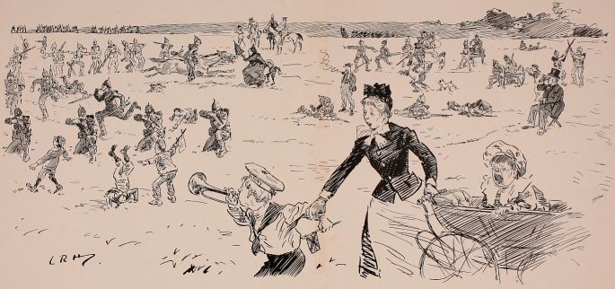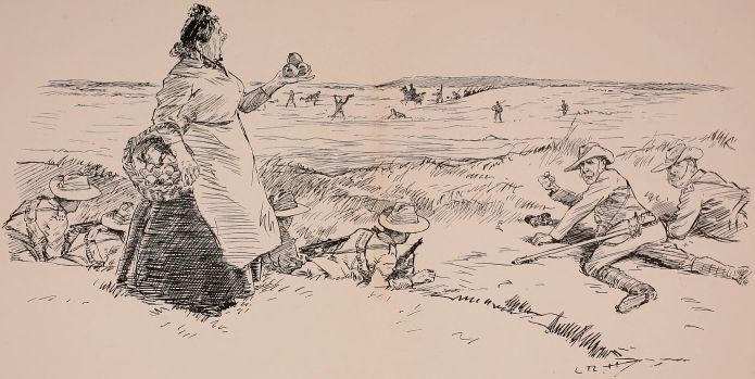 Friday.—Revelly 'arf 'our earlier this morning, as we 'ad a longish march to do. Precious 'ot it were, too, an' we were main glad to get a rest before beginning operations. Don't know what we was supposed to be doin', but we got posted on the side of an 'ill where we could 'ave seen everything as was goin' on, but d'rectly you gets up to 'ave a look some one starts bellerin', "Lie down there!" till we all got the bloomin' 'ump. After a bit they takes us back the way we come and we lay down again, then they advances us up the 'ill again; then they shifts us about all over the shop, backerds an' forrards, till we didn't know where we was. At last a off'cer comes galloping over to our Colonel and they seemed to be 'avin' a few words, and we advances an' 'alts, advances an' 'alts, for about a hour an' a 'arf, an' then just as we was getting up to the firing line an' thinkin' this was a bit of all right at last, the bugles go, "Cease fire." "Taint fair," ses Dick Jennings; "let's shoot the bloomin' humpire." Getting back to camp were a bit thick, 'ow we did it without fallin' out I don't know. No one who aint done it theirselves knows wot marchin' ten mile in fours on a road two inches deep in dust is like; yer rifle weighs about a ton, an' yer water's gone at the first 'alt. The bloomin' band as ought to 'ave met us an' played us 'ome, went an' lost itself, an' never showed up till we was almost back to camp. Colonel 'e's give out as every man is to 'ave a hextra pint issued to 'im. I 'ad three more on my own; 'ad a bit of a sing-song in the evenin', but we was too tired to do much.