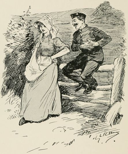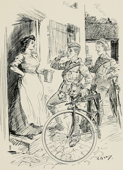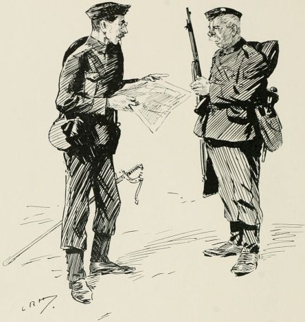 "Corporal, there's no doubt that we've lost touch with the column. We must work our way along the road till we come across a house and find out where we are; unfortunately, I forgot to bring my map with me." At last! a cottage. The men had better rest while I make a few inquiries. "Oh, you're a stranger in these parts? But, my good woman, is there any place where I can find——The Red Lion? Where's that? Just down the road, where those soldiers are running to?" Well, I'm——!