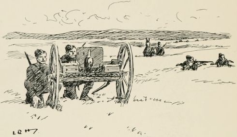 Wednesday.—Colonel rather grumpy about being disturbed. Did a futile Brigade attack to-day. Got told off as escort to some machine guns. Asked the Johnnie in command of 'em what he was going to do. Said he didn't know, but thought they wanted him to keep out of the way, and interrupt the attack as little as possible. M.G.'s usually looked on as a nuisance, I fancy. I suggested it would be rather sporting if we worked out well to a flank, and then imagined ourselves ambushed, and bolted back on the main body; give 'em awfully great opportunity of showing what they could do in an emergency, but he wouldn't rise to it. Simply a lovely chance lost of rotting up the show. Think I shall put in for the gun section next year.