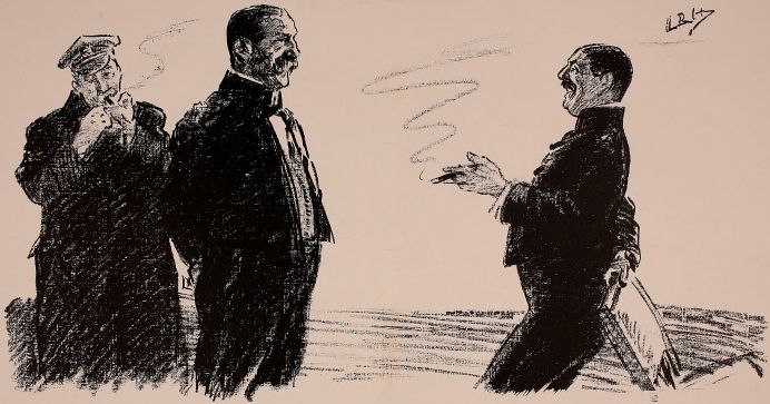 "'Well,' ses the General, 'takin' into consideration that, if the Volunteers is ever wanted, they'll be wanted in a hurry, I should suggest that they might be advantageously employed in fitting themselves for the task.' 'Excellent,' ses the Gov'mint; 'why ever wasn't it thought of before? Go on,' ses he. 'They should be trained,' ses the General, 'to the use of the most modern weapons, an' practised in the lessons which we 'ave learned by bitter experience, to the end that, in the event of an invasion, threatened or actual, every unit shall be able to take the field without delay, sufficiently organised an' equipped to carry it through a short campaign.' 'Marvellous!' ses the Gov'mint. 'It's my dream realised. I will be interviewed on the matter to-morrow.' 'Of course,' ses the General, 'this will undoubtedly entail a certain amount of hextra expense.' 'Not another word!' ses the Gov'mint. 'All bets is off! Train 'em, give 'em transport, stand 'em on their 'eads, or teach 'em to sing; anything you like as long as it don't cost anything. Take a fresh start,' ses 'e.
