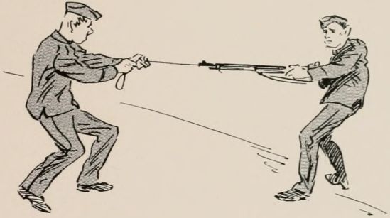 Rifles should be cleaned very carefully: one man should hold the rifle, and the other should manipulate the "pull-through."