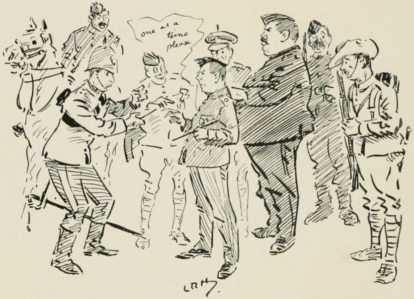 Got told off to the baggage guard at the station. Blessed if I don't think it was for being late for p'rade. Warn't sorry when the train started, as one of the chaps 'ad got hold of four bottles of beer as was all right. Just before the train stops our Serjint, 'e ses, "Look after our own company's baggage, an' never mind what anybody ses." But we 'adn't more than about started when a off'cer on a horse comes along an' wants to know who's in charge an' where is 'e. I tells 'im, an' then he ses we can't be all day over the job, an' we're to put all this lot into that truck. We ses we was told to put it in t'other. "Put it where I tell you," 'e ses. Bimeby along comes our off'cer, an' just takes one look at us, an' then started fairly in. As our Corp'ril said afterwards, it were a treat. I'd 'ave given the price of a pint to 'ave been able to sit still an' listen to 'im, an' yet to look at 'im in the ordinary way you'd think he couldn't get further than "Dash it all!" Then up comes the off'cer on the 'orse. "Are you in charge of this guard?" ses 'e. "Yes," ses our off'cer. "Well, you'll never get away at this rate, an' there's three more Battalions to detrain after you, an' I must 'ave those trucks back from the camp by six o'clock." "Very good; they will be here," ses our man. "Not at this rate," ses t'other. "My dear fellow," ses our off'cer, "my men aint regulars, but they can manage it all right in their own way if you'll leave 'em alone; but you're simply muddlin' us up now." "Can't help that," ses t'other. "I'm only responsible for the trucks, and they must be got away at once." "I'm responsible for the baggage," ses our man. "Either leave the job to me or take the whole thing over." "Oh, do as you like. I don't care a damn," ses the one on the 'orse. "No more do I," ses our off'cer. So we gets it together somehow an' marches off, the bloomin' traction-engine a-goin' about five miles an 'our an' we tryin' to keep up, all of us cussin' at everything. Don't catch me on a baggage guard again in a 'urry.