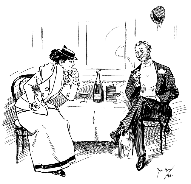 Phil May made his first appearance in Punch with a small drawing on October 14th, 1893. Ten of his drawings were published in its pages in 1894, and thereafter he rarely missed a weekly contribution and was well represented in the Almanacks. At first his humour, dealing as it often did with low life, was considered somewhat out of place in its sedate surroundings, and it was not until February, 1895, that his powers, admirably championed by Mr M. H. Spielmann, were fully recognized, and he was elected to the Punch staff, where he remained a much-valued and very popular member until his death. His initials are carved on the famous table between those of Thackeray and Du Maurier. At his first Punch dinner he was obviously shy and nervous and a little bored. At the end of the evening when nearly everyone had gone, he turned quietly and timidly to Bernard Partridge with his customary suggestion, ‘Let's go to Romano's and have a drink.’ When other engagements prevented him attending the dinner he generally managed to secure a copy of the menu as ‘evidence for Lil’.