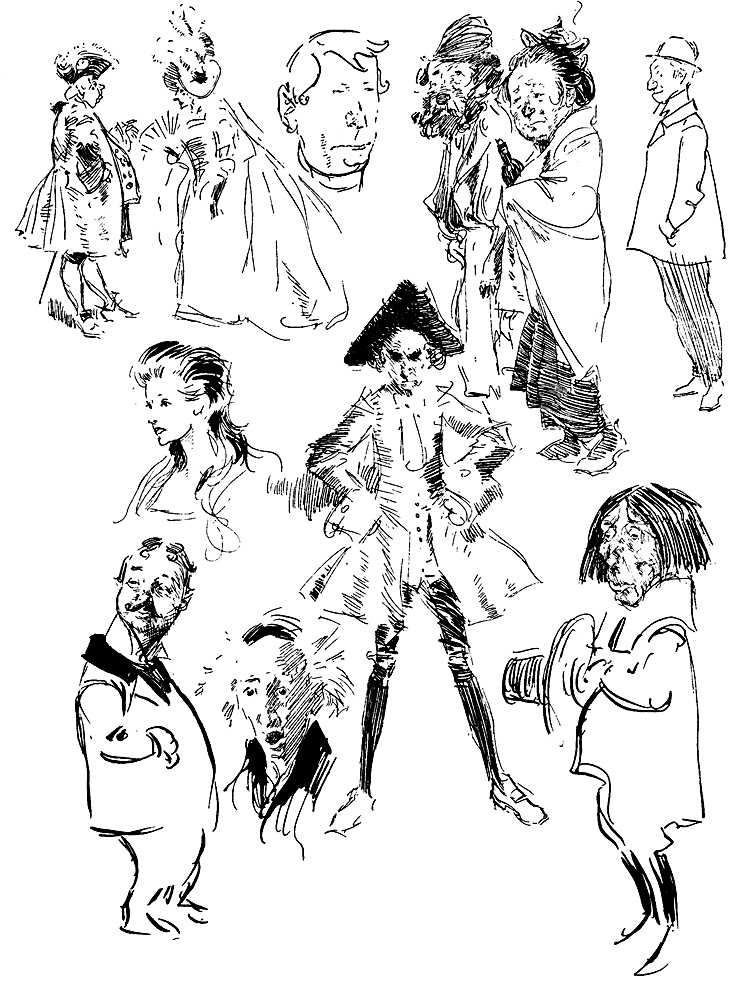 Their sea-journey back finished at Naples, and the Mays went thence to Rome. Here Phil set to work to justify his patron's liberality, but with all his study of the old masters he did not neglect the close observation of contemporary characters. Indeed, there can be no doubt that the world of his own day was May's best school, and the life about him offered a better training for an artist of his temperament than the works of the great painters of the past. Nevertheless Rome and its works of art and architecture impressed him deeply, and he expressed the fact in his own peculiar fashion when he wrote in a letter to his brother that ‘Be it ever so crumbly, there's no place like Rome.’ From Rome, after a short visit to London, he went to Paris, where he shared a studio and garden at Puteaux with Henry Thompson, a landscape painter. Thompson, whose portrait often appears in Phil May's drawings, afterwards edited the last seven of the Phil May Annuals. Among his other friends in Paris were William (later Sir William) Rothenstein, Charles Conder, and two Americans, both well-known illustrators, W. T. Smedley and C. S. Reinhardt.