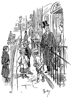 Many of the earlier Punch artists--Doyle, Keene, Leech and Sambourne among them--had been first presented to the public in its own pages. Phil May, with Bernard Partridge and Raven-Hill, belonged to a later generation, who had made their reputation elsewhere before joining the staff. Little or nothing in the way of official recognition came to any of the band, although John Tenniel and, later, Bernard Partridge received the honour of knighthood. In 1896, after the publication of Gutter-snipes, May was elected R.I., the only contemporary black-and-white artist who shared the distinction with him being Hugh Thomson. Lord Leighton, then President, who greatly admired May's work, wished to see him proposed for election as Associate of the Royal Academy; but Leighton's death early in 1896 ended the idea, for no other academician of that time had the temerity to adopt it.