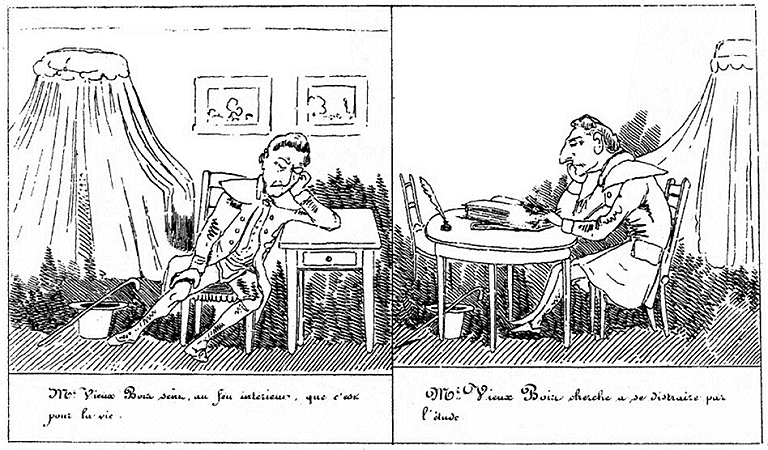 | Mr. Vieux-Bois éprouve que d'être hermite, ça ne fait pas le bonheur. | Et que ça attise plus que ça n'éteint. | En d'affreux soupçons!! | En un déplorable abattement. |