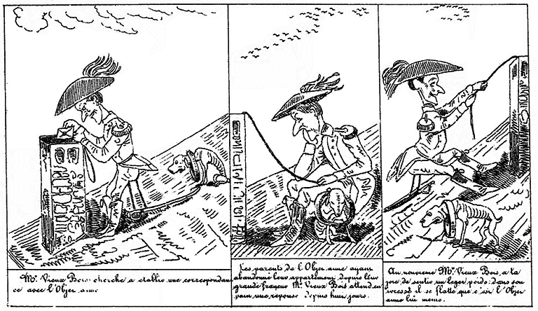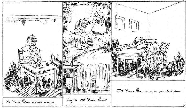| Mr. Vieux Bois cherche à établir une correspondance avec l'objet aimé. | Les parents de l'objet aimé ayant abandonné leur appartement depuis leur grande frayeur, Mr. Vieux-Bois attend en vain une réponse depuis huit jours. | Au neuvième, Mr. Vieux-Bois a la joie de sentir un léger poids; dans son ivresse, il se flatte que c'est l'objet aimé lui-même. |