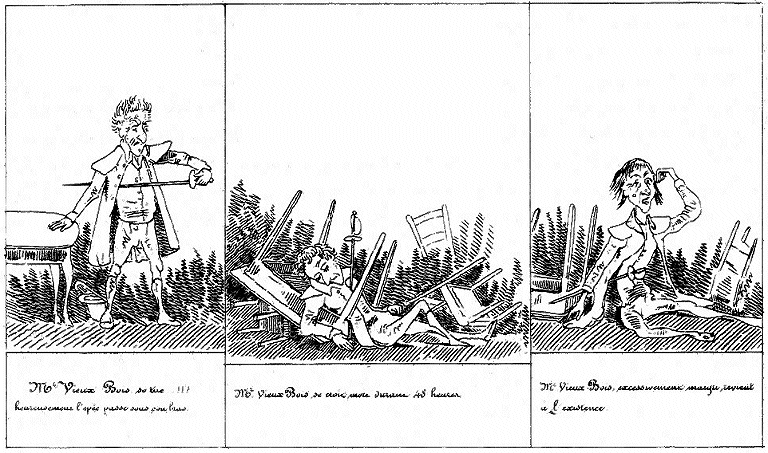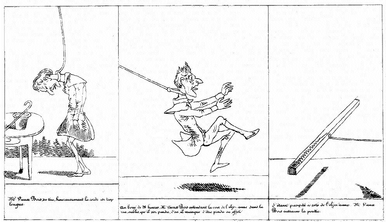 | Mr. Vieux-Bois se tue, heureusement la corde est trop longue. | Au bout de 28 heures, Mr. Vieux-Bois entendant la voix de l'objet aimé dans la rue, oublie qu'il s'est pendu, d'où il risque d'être pendu en effet. | S'étant précipité à coté de l'objet aimé, Mr. Vieux-Bois entraîne la poutre. |