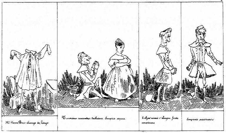 | Mr. Vieux-Bois change de linge. | Troisième rencontre, déclaration, soupir, espoir. | L'objet aimé s'éloigne, forte amertume. | Soupçons naissants. |