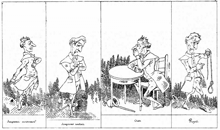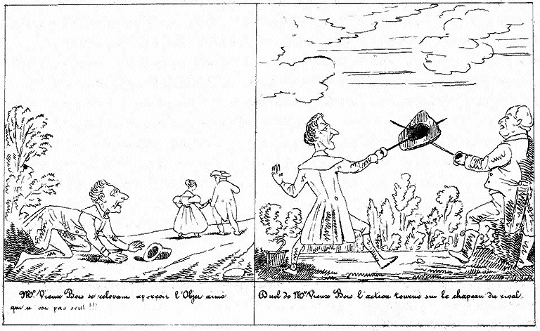 Duel de Mr. Vieux-Bois, l'action tourne sur le chapeau du rival. |