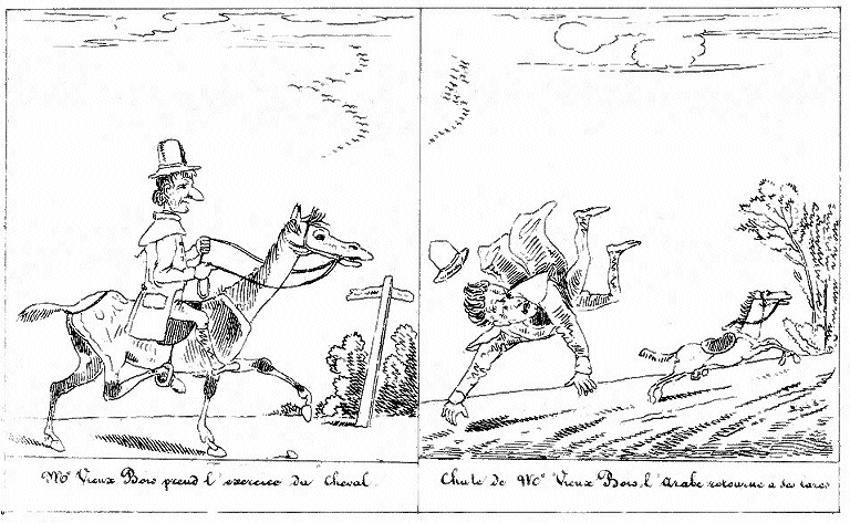 | Mr. Vieux-Bois prend l'exercice du cheval. | Chute de Mr. Vieux-Bois, l'arabe retourne à ses lares. |