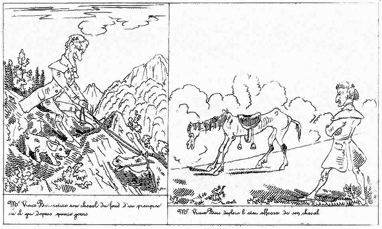 | Mr. Vieux-Bois retire son cheval du fond d'un précipice où il gît depuis quinze jours. | Mr. Vieux-Bois déplore l'état affreux de son cheval. |