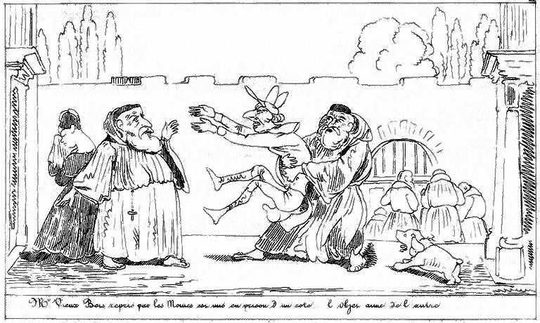 | Les deux moines entendant un grand bruit derrière eux, sont très inquiets, et crient au secours de toute leur force. | Le rival qui s'était déjà précipité à moitié, entendant crier au secours s'empresse d'accourir et voyant de quoi il s'agit s'adjuge de nouveau l'objet aimé. |