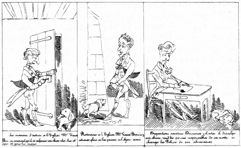 | Au moment d'entrer à l'église Mr. Vieux-Bois se souvient qu'il a enfermé son chien chez lui et revient pour lui ouvrir. | Retourné à l'église, Mr. Vieux-Bois n'y retrouve ni les parents ni l'objet aimé. | Dispositions sinistres. Dernières volontés; il disculpe son chien, rend les parents responsables de sa mort, et charge la police de son inhumation. |