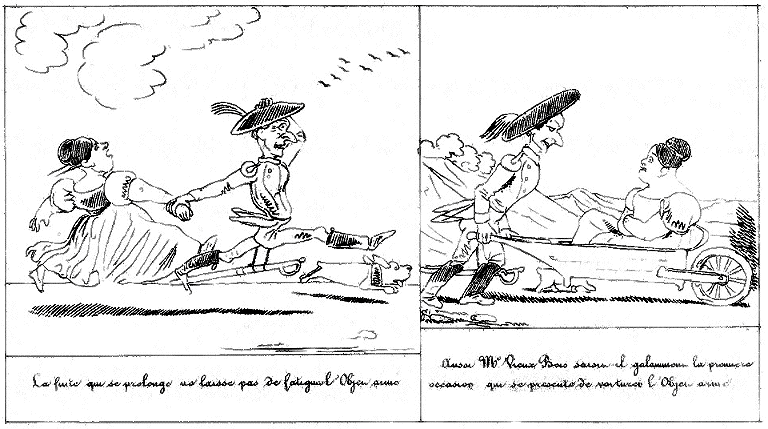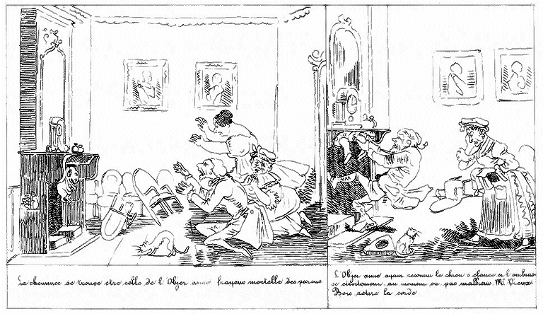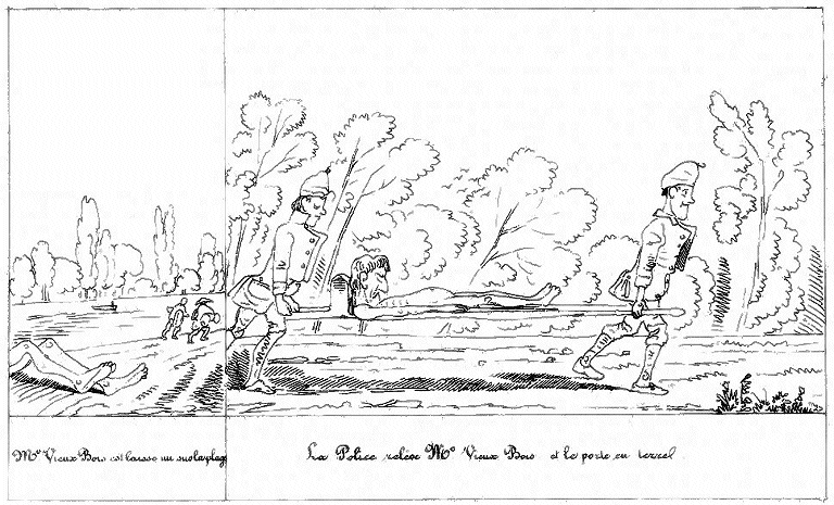 | Précieux moments qui payent de bien des peines. | Tout en tenant les plus tendres propos, Mr. Vieux-Bois observe fortement les localités. | Le Bourgeois qui est allé chercher la police, n'ayant personne à lui montrer, est provisoirement arrêté, comme mauvais drôle, un peu farceur. |