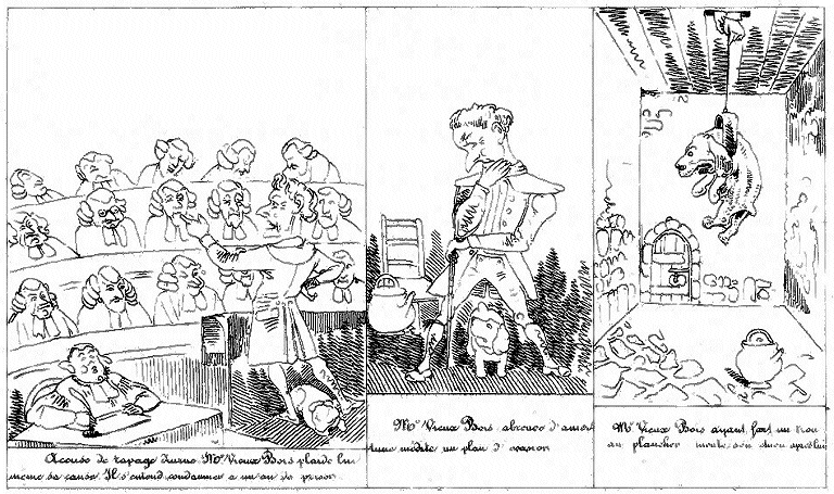 | Accusé de tapage diurne, Mr. Vieux-Bois plaide lui-même sa cause. Il s'entend condamné à un an de prison. | Mr. Vieux-Bois abreuvé d'amertume, médite un plan d'évasion. | Mr. Vieux-Bois ayant fait un trou au plancher, hisse son chien après lui. |