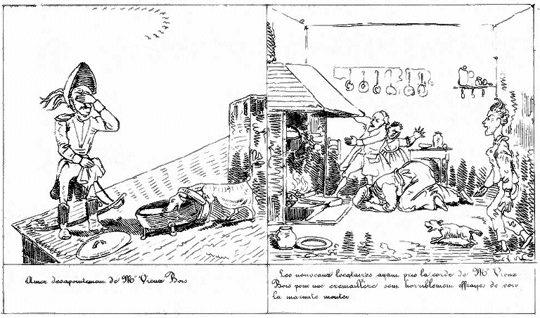 | Amer désapointement de Mr. Vieux-Bois. | Les nouveaux locataires ayant pris la corde de Mr. Vieux-Bois pour une crémaillère sont horriblement effrayés de voir la marmite monter. |