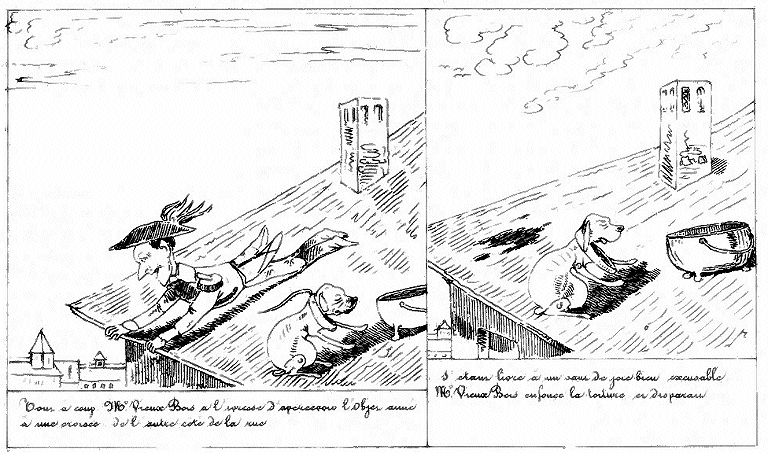 | Mr. Vieux-Bois apprend du petit ramoneur que l'objet aimé a passé quatre jours sur un toit avec sa famille. | Mr. Vieux-Bois prend en croupe le petit ramoneur pour se faire montrer le toit en question. | Mr. Vieux-Bois arrivé sur le toit comprend toute l'affaire, et retrouve son chien exténué. |