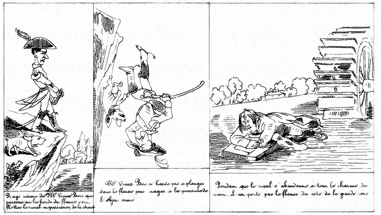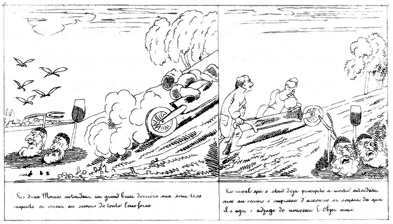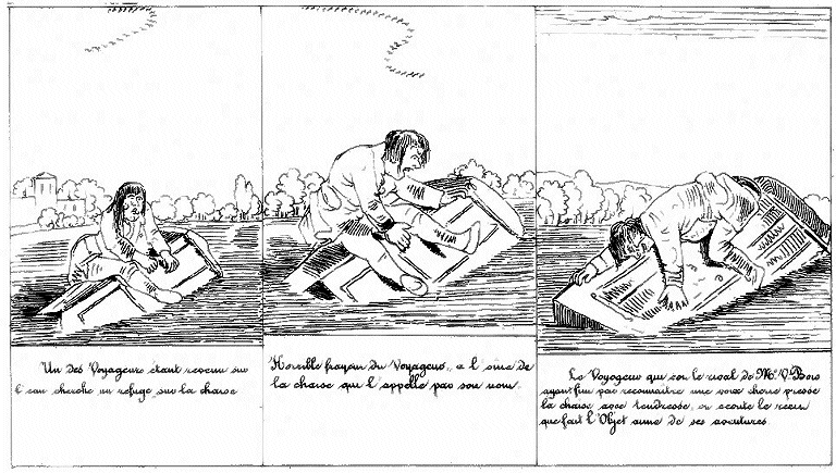 | Rage intime de Mr. Vieux-Bois qui parvenu sur les bords du fleuve voit flotter le rival en possession de la chaise. | Mr. Vieux-Bois n'hésite pas à plonger dans le fleuve pour nager à la poursuite de l'objet aimé. | Pendant que le rival s'abandonne à tout le charme du récit, il est porté par le fleuve du côté de la grande roue. |