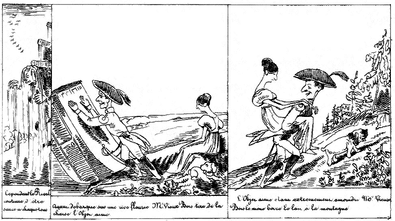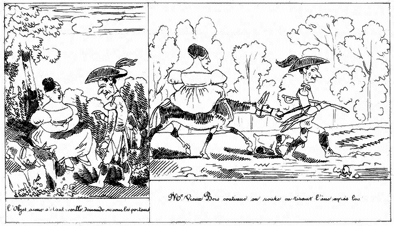 | Arrivé dans un vallon Mr. Vieux-Bois lance son cheval dans de gras pâturages. | Le cheval ne peut plus avancer, par trop d'embonpoint. | La solitude du pâturage rallume la passion de Mr. Vieux-Bois. |