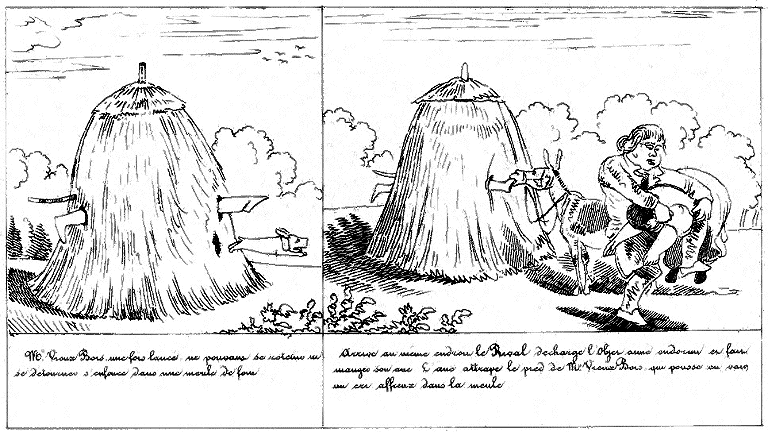 | Mr. Vieux-Bois, une fois lancé, ne pouvant se retenir ni se détourner, s'enfonce dans une meule de foin. | Arrivé au même endroit, le rival décharge l'objet aimé endormi et fait manger son âne. L'âne attrape le pied de Mr. Vieux Bois, qui pousse en vain un cri affreux dans la meule. |