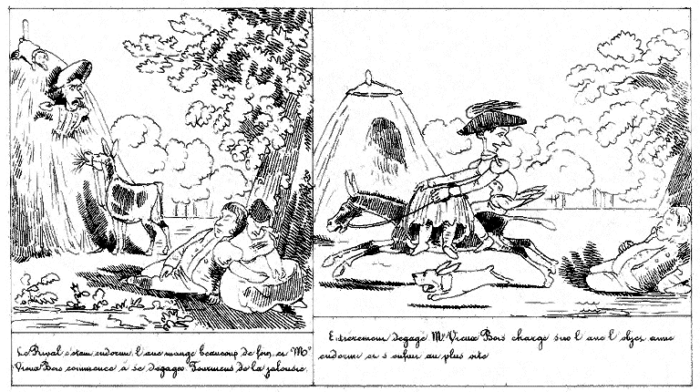 | Le rival s'étant endormi, l'âne mange beaucoup de foin, et Mr. Vieux-Bois commence à se dégager. Tourments de la jalousie. | Entièrement dégagé, Mr. Vieux-Bois charge sur l'âne l'objet aimé endormi et s'enfuit au plus vite. |