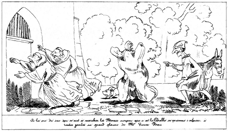 A la vue du sac qui se met à marcher, les moines croyant que c'est le Diable en personne s'enfuient à toute jambe au grand plaisir de Mr. Vieux-Bois.