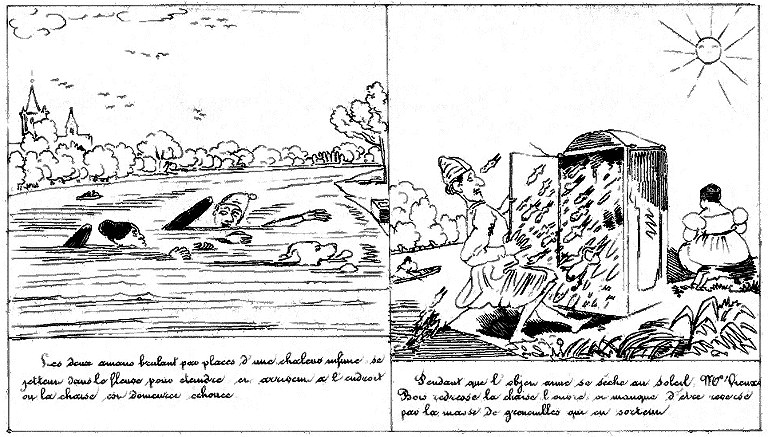 | Le deux amants brûlant par places d'une chaleur infinie, se jettent dans le fleuve pour éteindre, et arrivent à l'endroit où la chaise est demeurée échouée. | Pendant que l'objet aimé se sèche au soleil, Mr. Vieux-Bois redresse la chaise, l'ouvre, et manque d'être renversé par la masse de grenouilles qui en sortent. |