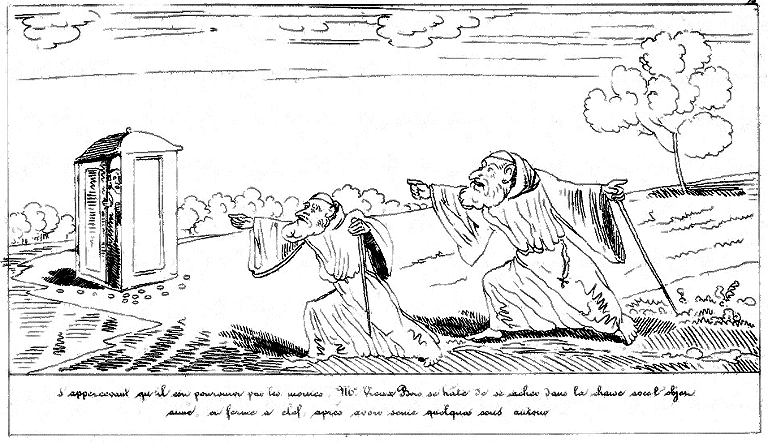 S'apercevant qu'ils sont poursuivi par les moines, Mr. Vieux-Bois se hâte de se cacher dans la chaise avec l'objet aimé, et ferme à clef, après avoir semé quelques sous autour.