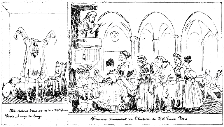 | Mr. Vieux-Bois, ayant eu du dessus, fait la demande aux parents, en présence de l'objet aimé. | Mr. Vieux Bois, accepté, rentre chez lui et s'y livre pendant trois heures à des sauts de joie. |