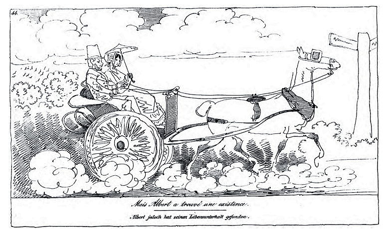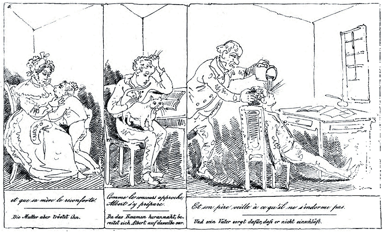 | Par malheur, le jour du concours, Albert s'oublie devant une ménagerie. | Ce qui est cause que son père le morigine, | et que sa mère le réconforte. | Le collège terminé, on délibère sur la carrière d'Albert qui insiste pour poursuivre celle des études, parce que, au collège, ce qui l'ennuyait, c'étaient les éléments. |