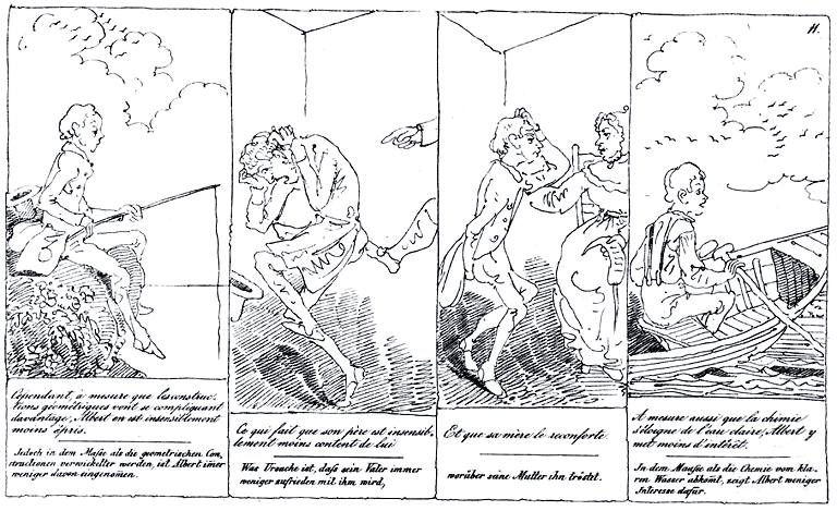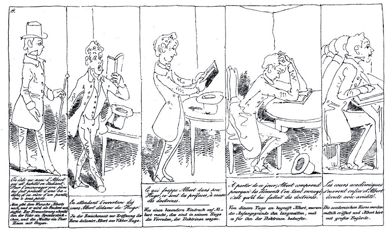 | Enchanté de cette réponse, Albert fait imprimer ses Odes avec la lettre pour préface et son portrait en tête. | Ce livre est lancé sous le titre de Harmonies orageuses et Albert ne s'occupe plus que de ressembler à son portrait. | Les gens lisent l'affiche et Albert jouit de sa célébrité naissante. | Retourné aux études, Albert écoute avec gravité, mais il trouve la matière bien peu approfondie et son professeur bien peu célèbre. |