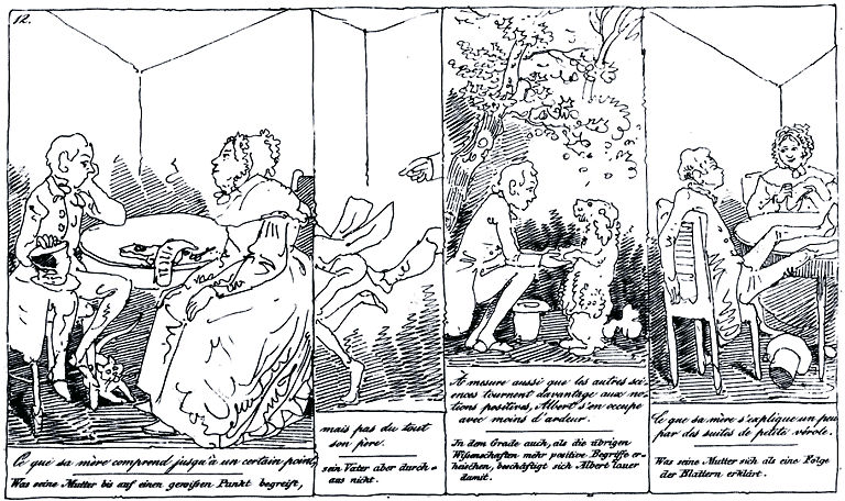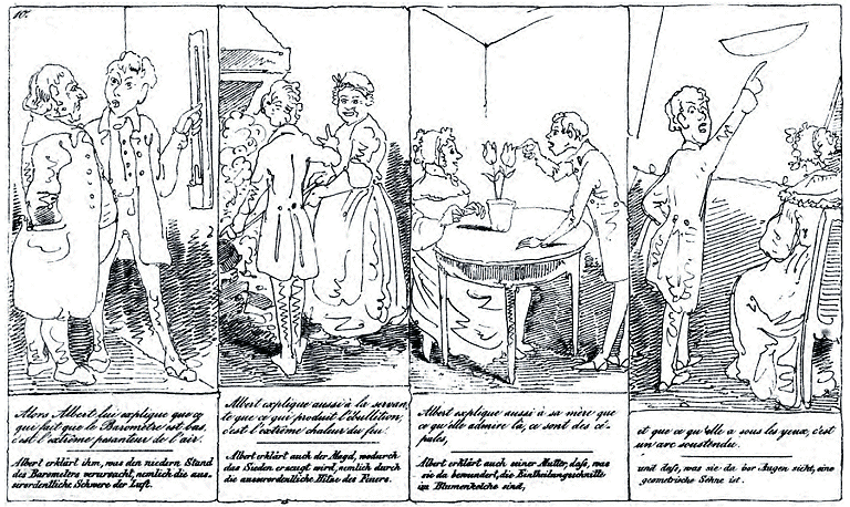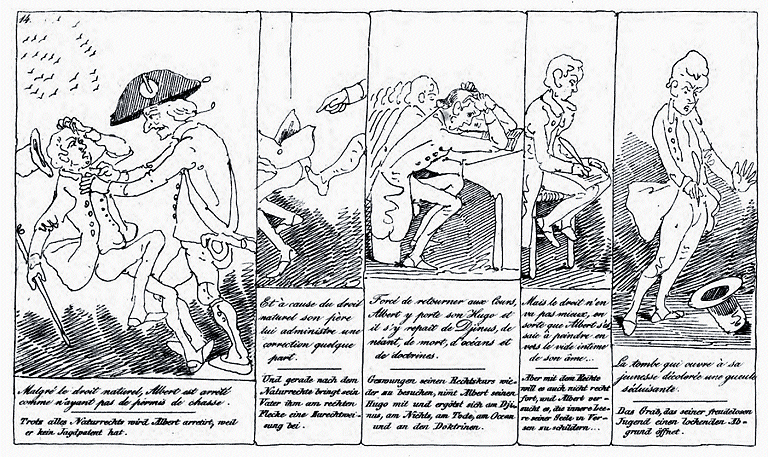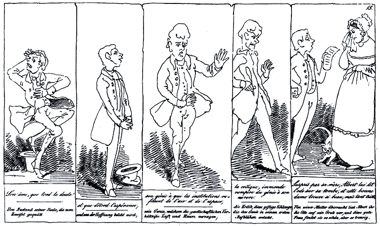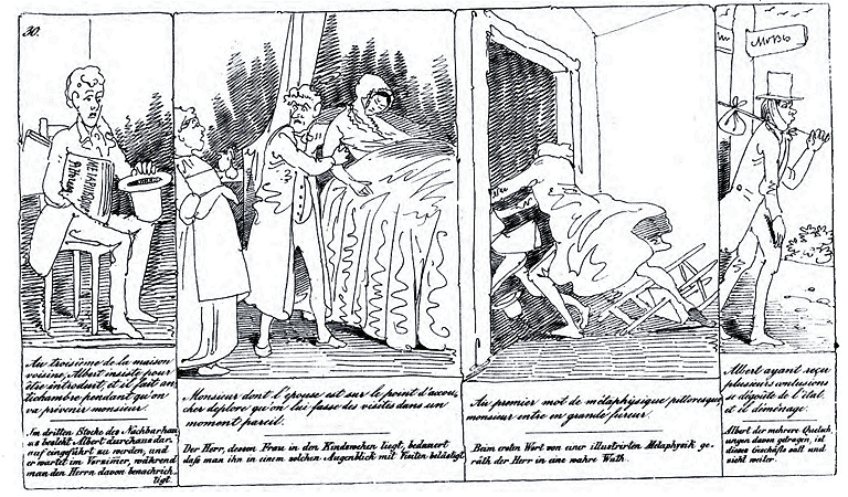 | Au troisième de la maison voisine, Albert insiste pour être introduit, et il fait antichambre pendant qu'on va prévenir monsieur. | Monsieur dont l'épouse est sur le point d'accoucher déplore qu'on lui fasse des visites dans un moment pareil. | Au premier mot de métaphysique pittoresque, monsieur entre en grande fureur. | Albert ayant reçu plusieurs contusions se dégoûte de l'état et il déménage. |