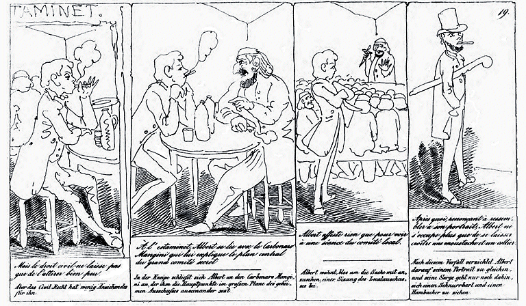 | Mais le droit civil ne laisse pas que de l'attirer bien peu. | A l'estaminet, Albert se lie avec le Carbonaro Mangini qui lui explique le plan central du grand comité secret. | Albert assiste rien que pour voir à une séance du comité local. | Après quoi, renonçant à ressembler à son portrait, Albert ne s'occupe plus que de se laisser croître une moustache et un collier. |