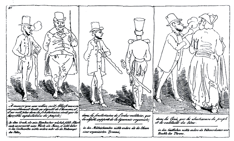 | L'on va faire un tour, et les quatres amis ont bientôt appris des publicistes de l'endroit que le Canton gémit sous le joug sans nom d'une aristocratie échevelée. | Que le gouvernement y est la proie d'hommes personnellement doux et habiles, mais politiquement astucieux et incorrigibles. | Que le peuple y est heureux et libre, mais ne se comprenant pas et n'étant pas compris. | Qu'en conséquence le moment est venu d'apprendre au peuple à se comprendre et à être compris. | Secondé par les amis politiques et par les publicistes de l'endroit, Albert fonde un journal. |