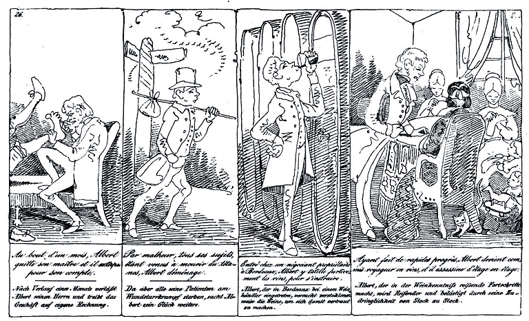 | Au bout d'un mois, Albert quitte son maître et extirpe pour son compte. | Par malheur, tous ses sujets étant venus à mourir du tétanos, Albert déménage. | Entré chez un négociant propriétaire à Bordeaux, Albert y tatille furtivement les vins, pour s'instruire. | Ayant fait de rapides progrès, Albert devient commis-voyageur en vins, et il assassine d'étage en étage. |