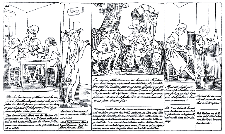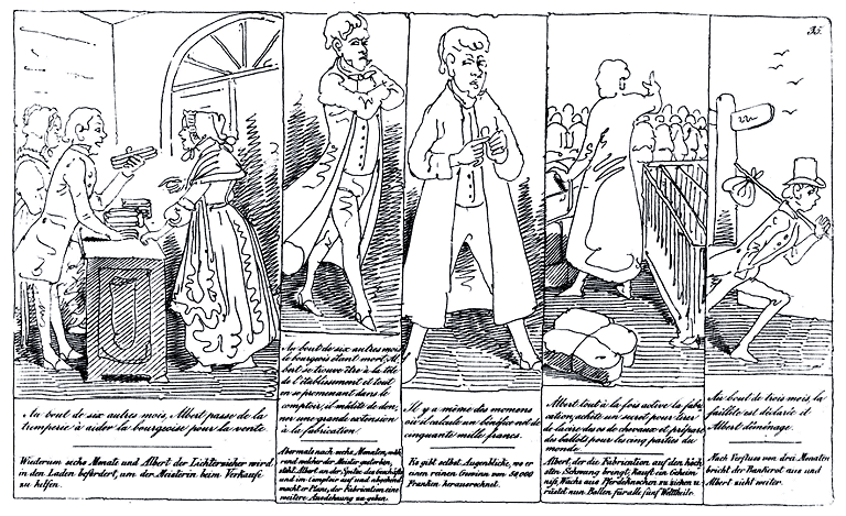 | Par malheur le chocolat se trouve avoir le goût de Guano, et la consistance de la craie de Briançon. | La faillite est déclarée et Albert déménage. | Dégoûté du commerce, Albert entre comme instituteur chez le Comte Baldaquin. | Mais le Comte lui explique qu'il veut pour ses enfants point du tout de physique de droit naturel ni de doctrine, et, au contraire, beaucoup d'orthographe et d'arithmétique. |